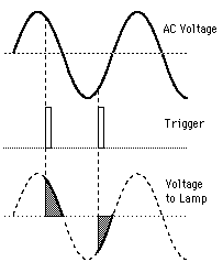 SCR Lighting ControlEfficient lighting control with SCR devices requires two SCRs reversed with a common trigger as shown since they conduct in only one direction. This makes the control similar to the TRIAC. ![]() |