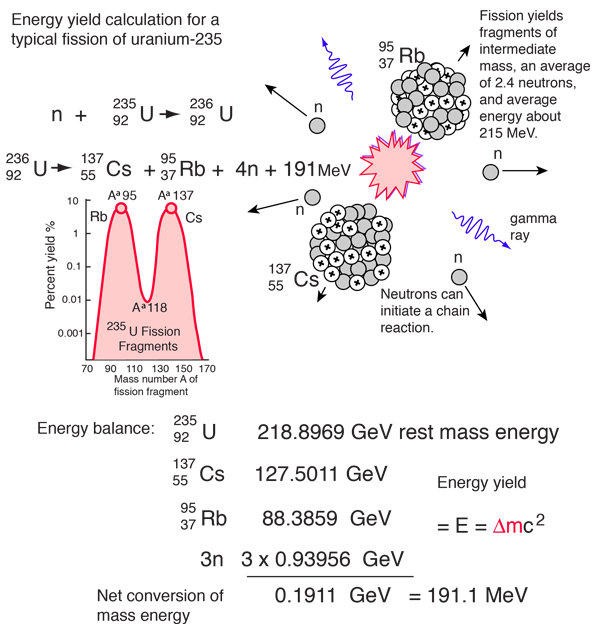 Example of Energy Yield: Uranium-235 FissionNuclear fission of uranium-235 yields an enormous amount of energy from the fact that the fission products have less total mass than the uranium nucleus, a mass change that is converted to energy by the Einstein relationship E = mc2. ![]()