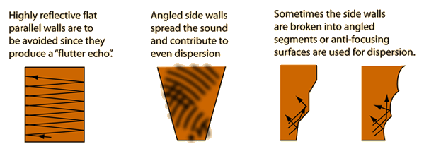 Even DispersionSound is more pleasing if it is evenly dispersed, with no prominent echoes, no significant "dead spots" or "live spots" in the auditorium. This even dispersion is usually achieved by avoiding any focusing surfaces and avoiding large flat areas which reflect sound into the listing area. Sometimes it is desirable to add some anti-focusing surfaces. ![]()
