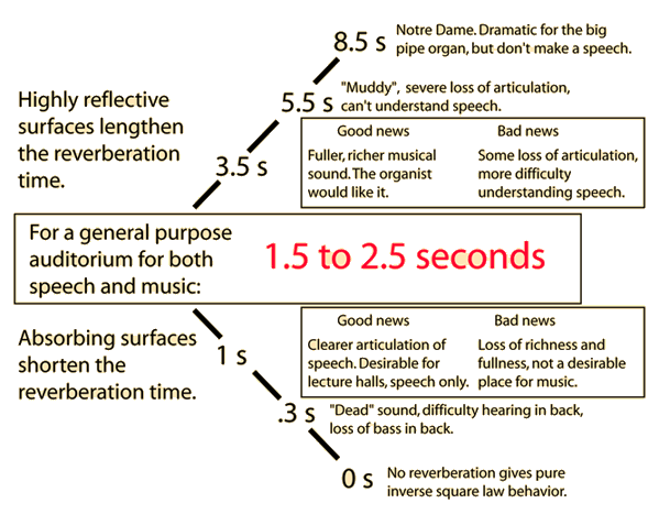 Projection of SoundA good auditorium will accomplish effective projection of the sound to the rear of the auditorium so that those distant listeners will not experience the extreme loss of sound level caused by the inverse square law. That projection is normally achieved by having a sufficiently long reverberation time. Another significant contributer will be a high, reflective ceiling to reflect sound to the back of the auditorium.