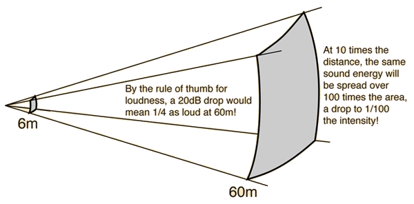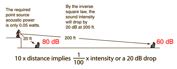 In an open area, sound drops off according to the inverse square law. In an auditorium where the front seats are 6 meters (20 ft) from the sound source and the back seats are 60 m (200 ft) from the sound source, the sound intensity would drop by a factor of 100 ( = 20 decibels )