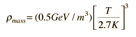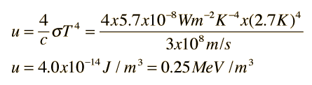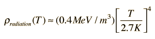 Division of Energy Between Photons and Massive ParticlesOne of the ideas associated with modeling the Big Bang is that the further back in time you project, the more the universe is dominated by photons. We think of today's universe as mostly matter, but the energy of the early universe was mostly photon energy with massive particles playing a very small role. The amount of energy in radiation in today's universe can be estimated with the use of the Stefan- Boltzmann law, considering that the universe is filled with blackbody radiation at a temperature of 2.7 K. The energy density in this equilibrium radiation is given by ![]() There is also a background energy in neutrinos which is expected to have a temperature of about 1.9 K, and there are 7/4 as many of them as photons according to the standard model. Treating them as massless particles would give an energy density of about 0.11 MeV/m3, so the total energy density in photons and neutrinos is about