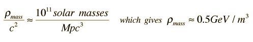 One current estimate of the amount of mass in the current universe is ,Note that this energy in massive particles is that of ordinary baryonic matter, but the associated density falls far short of the critical density that apparently characterizes the universe. The density is typically expressed in terms of a density parameter, Ω.