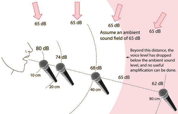 Moving Microphone Closer to SourceIt is sometimes hard to convince a performer that one should move closer to the microphone rather than farther away if the system rings from feedback. Moving the source closer to the microphone and decreasing the amplification improves the chances of getting an adequate sound signal to the listener. The improvements obtainable by close-miking can be modeled fairly accurately from the simplified amplification system because the source is typically close enough for the microphone to be in the direct sound field where the inverse square law holds. When the performer doubles the distance to the microphone, their signal into the microphone drops by 6 decibels while the input from reverberant sound and noises in the auditorium do not change appreciably. Therefore holding the microphone closer not only strengthens the signal to the microphone but also increases the signal-to-noise ratio and the potential acoustic gain. ![]()