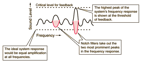 Notch FiltersWhen a non-uniform frequency response of an amplification system/room combination causes the system to "ring" before giving adequate amplification, the potential acoustic gain can sometimes be improved with the use of notch filters to take out the offending frequencies as illustrated below. Shown is the use of two notch filters to discriminate against the two most prominent peaks in the frequency response. ![]() Often several such tunable notch filters are packaged together and marketed as "feedback suppressors" . Sometimes such feedback suppressors are used to smooth out the roughest spots before undertaking a full-fledged equalization of the sound system.
