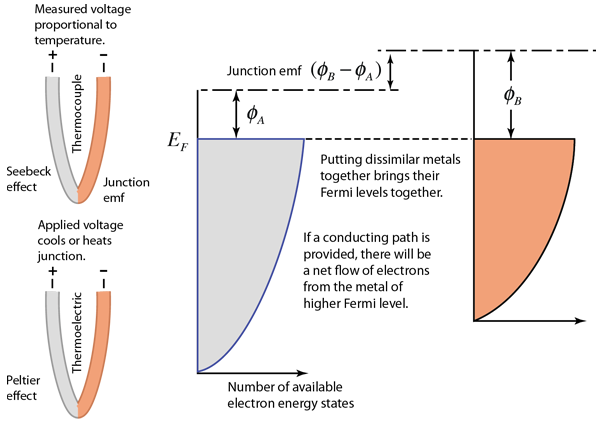 Junction EmfsWhen two dissimilar metals are put into contact with each other, a small voltage in the millivolt range is generated. This junction emf is temperature dependent and can be used as a thermometer by making up a thermocouple from two wires of dissimilar metals. The production of a junction emf is associated with the difference in the Fermi levels of the two metals. If an electron in a metal is at the Fermi level EF of energy in a metal, then a certain amount of energy is required for the electron to just escape from the metal, and this energy is referred to as the "work function" φ of the metal. Dissimilar metals will in general have different work functions, so if such metals are brought into firm contact where electrons can transfer back and forth between them, there will be an effective emf or voltage between them equal to the difference in the work functions φA - φ B. If there is a conductive path to form a complete circuit, then electrons will flow from the the metal of higher Fermi level to the one with lower Fermi level. However, if the complete electric circuit is made with wires of the same metals joined together at both ends, and the two junctions are at the same temperature, there will be no net flow of electrons around the circuit since the two junction potentials cancel each other. Useful devices can be made by maintaining the two junctions of such a circuit at different temperatures. The widespread use of thermocouples arises from the measurement of the junction potential since it is temperature dependent. However, the temperature dependence is nonlinear and must be empirically calibrated to give an accurate indication of temperature. This temperature dependence of the junction potential was discovered by Seebeck in 1821, so is often called the "Seebeck effect". Typical voltages for a single junction are on the order of 10-6 volts/K, so to get a higher signal voltage a number of them are often combined in series in a temperature probe. With a large number of junctions and a sufficient amount of heat, a thermoelectric generator can be produced. Since space missions require an extended period of electric power production, the use of the heat from radioactive decay has been used to create Radioisotope Thermoelectric Generators (RTGs). At the time of landing of the Mars Science Laboratory in August of 2012, the United States had launched 45 RTGs as parts of 26 space missions. The "Peltier effect" is the converse of the Seebeck effect and involves the use of a driving voltage to force current through the junction of dissimilar metals. It results in the cooling of the junction if forced to flow in one direction, and heating of the junction if it is forced in the opposite direction. This is used to advantage to create small thermoelectric refrigerators. Ohmic electric heating will be superimposed on the Peltier effect at the junction, which is an advantage if heating is your intent, but works against your thermoelectric refrigerator. Another effect with metallic conductors which is related to the Peltier and Seebeck effects is called the "Thomson effect". It is a heating or cooling effect in a metal if current is forced to flow along a thermal gradient that is maintained in the metal. The effective kinetic energy of electrons near the Fermi level is slightly higher for higher temperatures. If an emf causes an electron flow from a cooler to the warmer end of a metal rod, the electrons will need to gain some kinetic energy so they will be in equilibrium at the warmer end. They must get this energy from the thermal reservoir of the crystal lattice, so there will be some cooling effect on the metal lattice at that end. ![]() |