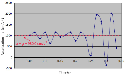 Now taking differences between the calculated average velocities and dividing by 1/60 second gives a plot of the average acceleration as a function of time. It hardly looks like constant acceleration, but we have several excellent excuses. First, the raw measurement data has now been multiplied by 3600, accentuating any measurement uncertainties. Second, the rocking of the falling bob that became evident in the velocity plot above is further accentuated in the acceleration plot. But the rocking motion is periodic and tends to cancel out in the average value of the acceleration, and the average acceleration obtained from the 19 position measurement was 980.00 cm/s2! Compared to the standard value of g for Atlanta, which is 979.5 cm/s2, this value only deviates 0.05% from the standard value. Here we are reporting probably the best value we ever got, but the values from this experiment are usually between 960 and 1000 cm/s2, so it is a good freefall experiment.