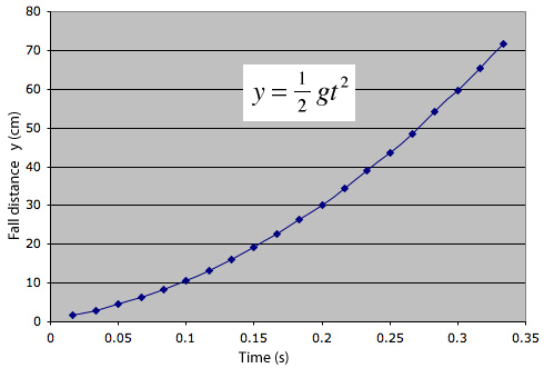 The plot of the measured distance data above gives an impressive quadratic curve, just as the motion equations predict for a constant acceleration.