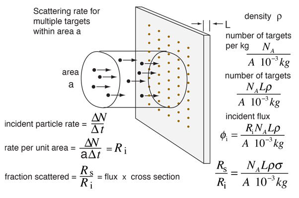 Scattering Cross SectionThe concept of cross section, as its name suggests, is that of effective area for collision. The cross section of a spherical target is ![]() The units of cross section are then area units, but for nuclear scattering the effective area is on the order of the cross sectional area of a nucleus. For a gold nucleus of mass number A=197, the radius determined from the nuclear radius relationship is about 7 fermis. ![]() The most common unit for cross section for nuclear scattering interactions is the barn. The cross section in barns for alpha scattering above a selected angle is a standard part of the analysis of Rutherford scattering. In the case of 6 MeV alpha particles scattered from a gold foil, for example, you don't know the impact parameter for any given alpha particle, so the calculation of the scattered fraction takes on a statistical character. For alpha particles bombarding a gold foil of thicknes 1 micrometer, less than 1 in 100,000 would meet the conditions for scattering at over 140°. The cross section for scattering at smaller angles will be larger, because the alpha doesn't have to come as close to be scattered through the smaller angle. For example, the cross section for scattering through 90° or above is 11.3 barns. For neutron scattering, there is no coulomb repulsion, so there is no appreciable scattering unless the impact parameter is less than the effective radius for the strong interaction. Therefore for a given target geometry the cross sections are smaller, typically measured in millibarns. Since the probability for interaction depends upon the strength and range of the interaction, the cross-sections for neutrino interactions are very small since they interact only by the weak interaction.