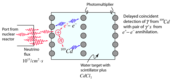 The gamma photons were detected by putting a scintillator material in a tank of water. The scintillator produced flashes of visible light in response to the gamma photons, and that light was detected by photomultiplier tubes. The neutrons were detected by putting cadmium chloride into the detector tank. Cadmium is a strong neutron absorber and finds use in control rods for nuclear reactors because of that. When absorbing a neutron, 108Cd produces an excited state of 109Cd which subsequently emits a gamma ray.