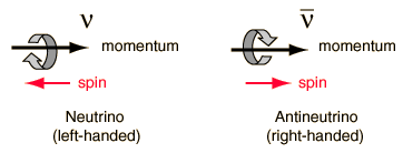 Left-Handed NeutrinosThe relative orientations of spin and linear momentum for neutrinos and antineutrinos is apparently fixed and intrinsic to the particles. ![]() This property is related to the concept of parity and to the conservation laws which apply to particle interactions. For neutrinos the spin is always opposite the linear momentum and this is referred to as "left-handed", whereas the antineutrinos are always "right-handed". This evokes the picture of the right-hand rule for vector angular momentum. In this convention, the fingers of the right hand are used to indicate the sense of the spin or orbital motion, with the thumb pointing in the direction of the defined angular momentum. The momentum of the particle is used to define a preferred direction in space, and if you curled the fingers of your right hand to show the sense of the "spin" of the antineutrino, your thumb would point in this momentum direction. Hence it is a "right-handed" particle. For the neutrino, you would have to use the fingers of your left hand to get your thumb to point in the direction of the linear momentum. Prior to 1956 all the available experimental evidence suggested that "left-handed" vs "right-handed" was not a meaningful characterization of particle interactions since the laws of physics appeared to conserve parity. Interactions which proceed by the strong and electromagnetic were shown by experiment to "conserve parity". But the theoretical work of Lee and Yang and the experiment with cobalt-60 decay by Wu showed that this decay by the weak interaction did not conserve parity. This causes the weak interactions which emit neutrinos or antineutrinos to violate conservation of parity. The property which has been called left-handed and right-handed here is called "helicity". The helicity of a particle is defined as the ratio ms/s, or the z-component of spin divided by the magnitude of the spin. By this definition in this case, the helicity is +1 for a right-handed antineutrino and -1 for a left-handed neutrino.