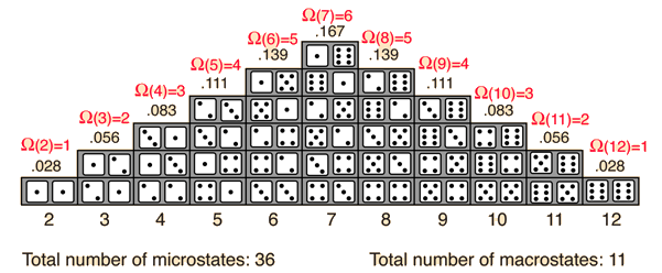 | Entropy as a Measure of the Multiplicity of a SystemThe probability of finding a system in a given state depends upon the multiplicity of that state. That is to say, it is proportional to the number of ways you can produce that state. Here a "state" is defined by some measurable property which would allow you to distinguish it from other states. In throwing a pair of dice, that measurable property is the sum of the number of dots facing up. The multiplicity for two dots showing is just one, because there is only one arrangement of the dice which will give that state. The multiplicity for seven dots showing is six, because there are six arrangements of the dice which will show a total of seven dots.  One way to define the quantity "entropy" is to do it in terms of the multiplicity. where k is Boltzmann's constant. This is Boltzmann's expression for entropy, and in fact S = klnΩ is carved onto his tombstone! (Actually, S = klnW is there, but the Ω is typically used in current texts (see Wikipedia)).The k is included as part of the historical definition of entropy and gives the units joule/kelvin in the SI system of units. The logarithm is used to make the defined entropy of reasonable size. It also gives the right kind of behavior for combining two systems. The entropy of the combined systems will be the sum of their entropies, but the multiplicity will be the product of their multiplicities. The fact that the logarithm of the product of two multiplicities is the sum of their individual logarithms gives the proper kind of combination of entropies. The multiplicity for ordinary collections of matter is inconveniently large, on the order of Avogadro's number, so using the logarithm of the multiplicity as entropy is convenient. For a system of a large number of particles, like a mole of atoms, the most probable state will be overwhelmingly probable. You can with confidence expect that the system at equilibrium will be found in the state of highest multiplicity since fluctuations from that state will usually be too small to measure. As a large system approaches equilibrium, its multiplicity (entropy) tends to increase. This is a way of stating the second law of thermodynamics. | Index Entropy concepts Reference Schroeder Ch 2 | ||
