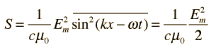 Energy in Electromagnetic WavesElectromagnetic waves carry energy as they travel through empty space. There is an energy density associated with both the electric field E and the magnetic field B. The rate of energy transport per unit area is described by the vector ![]() which is called the Poynting vector. This expression is a vector product, and since the magnetic field is perpendicular to the electric field, the magnitude can be written ![]() The rate of energy transport S is perpendicular to both E and B and in the direction of propagation of the wave. A condition of the wave solution for a plane wave is Bm = Em/c so that the average intensity for a plane wave can be written ![]() This makes use of the fact that the average of the square of a sinusoidal function over a whole number of periods is just 1/2. |