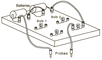 ELECTRIC CIRCUITSI. Qualitative investigation of series and parallel circuits An electric circuit consists of a completer closed path (or paths) for electric current. A "series" circuit has only one path for the electricity to follow. A "parallel" circuit has two or more paths for the electricity. You will first wire a simple circuit which will allow you to test materials for conductivity. Next some circuits will be wired to demonstrate the effects of series and parallel circuits on components in the circuit. ![]() PROCEDURE: 1. Connect your circuit board as indicated in the figure and note that the bulb will light when you touch the probes together. 2. Touch the ends of another wire with the probes. Note that the bulb lights brightly. This is an indication of good electrical conductivity since the current through the bulb is directly related to brightness. 3. Test several other items and record your results. Include a coin, your skin, and a beaker of water. Be sure that the probes a re in contact with the material being measured but not with each other. List the materials tested and your conclusions about their conductivity. 4. Rewire the circuit as shown in the diagram below. Is this a series or parallel circuit? ![]()