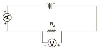 An ammeter will always be wired in series in a circuit. Failure to do this will result in blown fuses or damaged meters. Recall that the current has only one path to flow in a series connection, so the ammeter measures the current that flows through the circuit elements which are in series with it. The ammeters to be used will measure in milliamperes or 10-3 amperes. A voltmeter is always wired in parallel with the circuit elements it is testing and measures the voltage change across them. PROCEDURE: (Proper labeling of the circuit diagrams is part of your report.) A. Ohm's Law 1. Wire up the circuit as shown with the ammeter in place, observing the correct polarities. Set your meter selector switch for DC amperes and the range to the maximum. The "battery" in this case will be the round Flex Lab receptacles on your lab table which are connected to a DC power supply - DO NOT APPLY POWER until the circuit has been approved by the instructor. ![]() 2. After approval, apply power by connecting the wires to the DC receptacles and record the ammeter reading in milliamperes. Repeat the current measurement each of the other resistors by placing them in the circuit in place of the first one. 3. Disconnect the power leads and remove the ammeter from the circuit. Switch it to DC volts and connect it in parallel across the resistor. Reconnect the DC voltage and measure the voltage across the resistor. Repeat for the other resistors. 4. You now have voltage and current measurements for each resistor. Use Ohm's law to calculate the resistance for each resistor and compare the calculated value obtained from the labeling on the resistor or from the color code on the resistor. B. Distribution of Current. 1. Form the series circuit shown below. Since you will again be using the meter as an ammeter, reset its selector switch to DC amperes. Make sure it is correct before applying power. ![]() 2. Wire the ammeter successively in locations 1,2 3 and 4 and record the current value in each location. Note that conventional current is taken to be clockwise in this circuit, while the electrons will be circulating counterclockwise. What can you conclude about the current in a series circuit from your measurements? C. Distribution of Voltage The circuit wired in Part B will now be used to measure voltages. The connections illustrated below will be used, but since you will be using the same meter for an ammeter and a voltmeter, the ammeter will not be in place when you are measuring the voltages. ![]() 1. Measure the voltage across each resistor in turn and across the entire circuit, as indicated by V4. Record the results. 2. Compare the sum of voltages across the individual resistors to the voltage across the entire circuit. What can you conclude about the voltage in a series circuit? 3. Use the voltages across each resistor obtained in Step 1 above and the currents obtained from Section B above, along with Ohm's Law, to obtain values for the individual resistances. Compare the values with the given values for the resistors. 4. From the total voltage measured in Step 1 and the total current measured in Section B, calculate the equivalent resistance of the entire circuit composed of the three resistors in series. Compare this result with the sum RA + RB + RC. QUESTIONS: 1. What functions does a wire serve? Are there insulators associated with your apparatus? What do they do? 2. What, if anything, flows through the wires? 3. Why must there be two connections to a battery and to a light bulb? 4. If you have a 120 volt appliance and 2 amperes of current flow through it, what is the power used by it in watts? What is its resistance in ohms? 5. Why are your household receptacles wired in parallel rather than in series? |