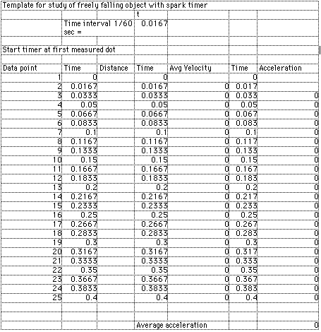 where v2 and v1 are the average velocities over any two successive time intervals t. In this experiment the acceleration of gravity, g, will be determined directly from the motion of a freely falling object using equations 3 and 4. APPARATUS The free-fall apparatus has an electromagnet to hold the object until the record of its fall is to be made. When the switch to the coils of the electromagnet is opened, the magnet can no longer hold the object, and it falls freely into a cup below. A sparking device of known frequency (60 Hz) passes each spark from an outer wire through a conducting metal ring on the object, through a waxed recording tape, and on to a second wire to complete the circuit. The passage of the spark through the waxed tape leaves a small mark or spot on the tape, marking the position of the falling object. With 60 sparks per second, the space between successive marks represents the distance that the object has fallen in 1/60 second. Since the object is accelerating, the distance between marks should increase. You will be provided with a tape from the free-fall apparatus. (A demonstration will be conducted so that you can see how the tape was made.) PROCEDURE 1. Secure the ends of the tape to the table with masking tape. 2. Look at the dots on the tape and note the way the distance between dots increases. You should be able to detect a "misfire" of the apparatus if a dot is missing or if there is an extra mark. If a dot is missing, you need to take that into account in entering your data into the calculation program described below.  3. Find a dot for a starting point by dropping down at least a centimeter from the first marks so that the falling object will have cleared the magnetic field influence. Label this dot zero (0) and measure the distance from this zero point to each successive dot, measuring as many as possible (at least a dozen). Please note that the distance to be measured is the total distance to each dot from the starting point (zero) and not the distance from the preceding dot. This procedure improves the accuracy of the set of measurements. These distance measurements are critical since they are multiplied by a large number in calculating the acceleration. Measure the distances to the nearest millimeter and then estimate to the nearest tenth of a millimeter. Place the meter stick on its edge so that the scale is next to the paper tape and look perpendicular to the meter stick when taking your reading. You may wish to tape the meter stick down to make sure it doesn't move between measurements. 4. A Spreadsheet is an excellent tool for repetitive calculations and the plotting of data. A template titled FreefallTemplate has been set up, and you can find it under the Apple menu (extreme top left of screen). Open that template and record your measured positions in it. The template should appear similar to the illustration below. Record your position data in the column titled "Distance". The Time columns are set up to reflect the 1/60 second interval of the spark timer. The zeros in the Avg. velocity and Acceleration columns are actually the result of formulas which depend upon the distance data which you will enter. 5. Make a plot of your Distance vs Time by clicking and holding down the mouse button in the upper left box of the first Time column a nd then dragging the mouse diagonally to select a rectangle including your time and distance data. Then release the mouse button and take the mouse up to click on the icon which looks like a magic wand over a bar graph. Then use the mouse to draw a rectangle out beside yur data table where you want the graph to appear. Follow the prompts to create a line graph of your positon data with the first column used as values for the horizontal axis. The slope of the distance vs time graph represents the rate of change of distance, which is the velocity. Why does the slope of the distance curve get steeper? 6. Repeat the process above to plot your Avg. Velocity vs Time. What does this graph tell you? What would the slope of the velocity vs time curve represent if it is likewise a rage of change with respect to time? Describe the slope of the velocity curve and explain its significance.  7. The values calculated for acceleration are meaningful only as far down as you have position data. Position the mouse on the first acceleration value below the level of your position data and click and hold down the mouse button. Drag the mouse down to the bottom of the column of numbers and release the mouse button to highlight these numbers. Choose Blank from the Edit menu to blank out those values. Then the calculation below should show the average acceleration in cm/s^2. (You can plot these acceleration values if you wish, but they generally swing pretty wildly because any position measurement errors are greatly magnified in the acceleration calculation.) Graphs of position and velocity represent one good way to analyze motion, and the analysis of straight line, constant acceleration motion such as freefall provides an instructive example. | Index | |||||||||||||||||