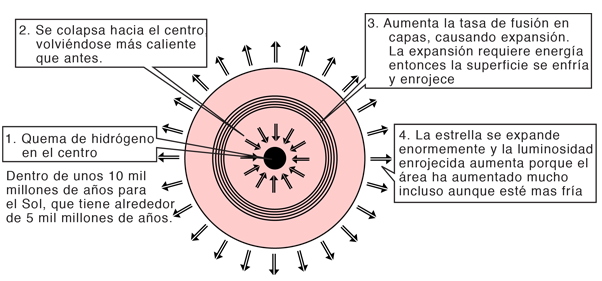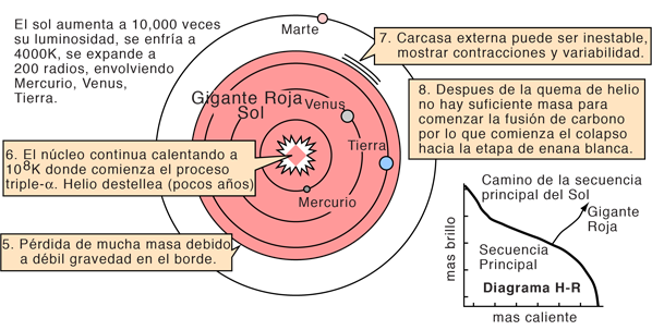 Fase de Gigante Roja del SolA partir de observaciones de numerosas otras estrellas que parecen ser similares a nuestro Sol, se prevé que el Sol eventualmente se moverá hacia arriba y a la derecha de su posición actual en la secuencia principal y entrará en una fase de gigante roja. La etapa final de nuestro Sol se prevé que sea como una enana blanca. ![]()