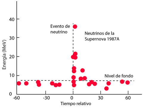 | Neutrinos de Supernova 1987ASe detectaron diez eventos de neutrinos en una instalación de detección de neutrinos en una mina profunda en Japón, que coincidió con la observación de la Supernova 1987A. Se detectaron dentro de un intervalo de tiempo de aproximadamente 15 segundos, en un contexto de eventos de neutrinos de baja energía. En una instalación similar IMB en Ohio, se detectaron 8 eventos de neutrinos en 6 segundos. Estas observaciones fueron realizadas 18 horas antes de la primera observación óptica de la supernova.
