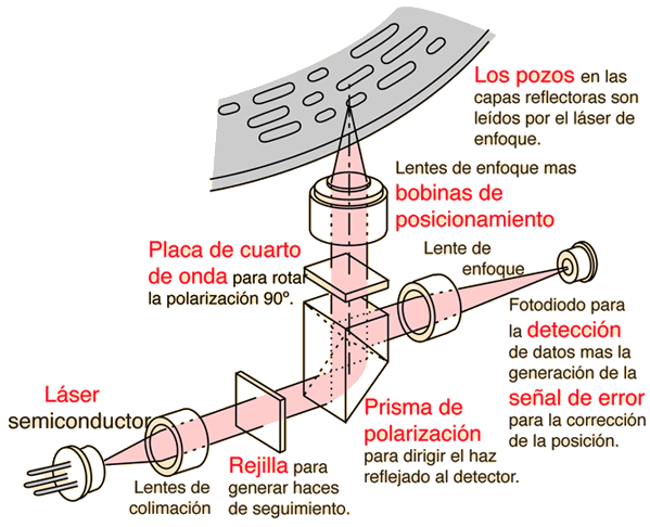 Laser del Disco CompactoLa detección de los datos binarios almacenados en forma de pits en el disco compacto, se realiza con el uso de un láser semiconductor. El láser está enfocado con un diámetro de aproximadamente 0,8 mm sobre la parte inferior del disco, pero está más enfocado a aproximadamente 1,7 micrómetros a medida que pasa a través del sustrato de plástico transparente para chocar contra la capa reflectante. El láser Philips CQL10 tiene una longitud de onda de 790 nm en el aire. La profundidad de los pits en el material de sustrato, es aproximadamente un cuarto de la longitud de onda de este láser. ![]() |