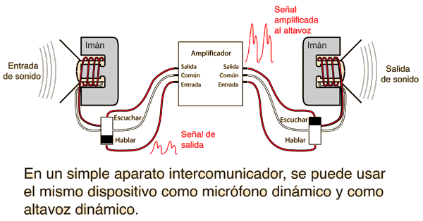 Un pequeño altavoz se puede utilizar como un micrófono dinámico, y este hecho es explotado en la construcción de pequeños sistemas de intercomunicación. Dependiendo de la posición del interruptor Habla-Escucha, el dispositivo en cualquier extremo del sistema de intercomunicación se puede utilizar como un micrófono o como un altavoz. Por supuesto, esto no es un proceso de alta fidelidad, y para micrófonos dinámicos comerciales, el dispositivo está optimizado para su uso como un micrófono no como altavoz.