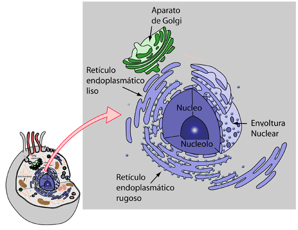 Retículo Endoplásmico![]() El retículo endoplasmático es una estructura membranosa multiplegada dentro de las células eucariotas, que desempeña un papel importante en la síntesis de las moléculas complejas requeridas por la célula y el organismo como un todo. A menudo, las membranas de estas estructuras se alinean con los ribosomas en sus superficies exteriores, dándoles una apariencia áspera. Esta parte se llama retículo endoplásmico rugoso, en contraste con el retículo endoplásmico liso, donde no hay ribosomas adjuntas. Los ribosomas del retículo endoplasmático rugoso fabrican proteínas que entran en los canales del retículo endoplasmático, y los trasladan a lugares donde pueden crear bolsas. Estas bolsas se pueden dividir como vesículas para transportar su carga de proteínas al complejo de Golgi para su distribución. Las proteínas producidas en las células secretoras, son ejemplos de síntesis de proteínas por el retículo endoplásmico rugoso. Estas incluyen las enzimas digestivas producidas en el estómago, y las hormonas de proteínas como la insulina producida en el páncreas. Los sistemas de órganos que producen muchas proteínas, tienen células con una gran cantidad de retículo endoplasmático rugoso. El retículo endoplásmico liso desempeña un papel importante en la síntesis de los lípidos, por medio de enzimas incrustadas en estas membranas lisas. Produce los fosfolípidos y el colesterol utilizados en la formación de la membrana, y junto con las proteínas de membrana producidas por el RE rugoso, puede sintetizar más de membranas por sí misma, para el complejo de Golgi, la membrana celular, los lisosomas, y otros. En las células del hígado el RE liso contiene enzimas para la desintoxicación de drogas nocivas y de subproductos metabólicos. En los órganos reproductivos, el ER liso en las células, produce las hormonas esteroides testosterona, y estrógeno. |