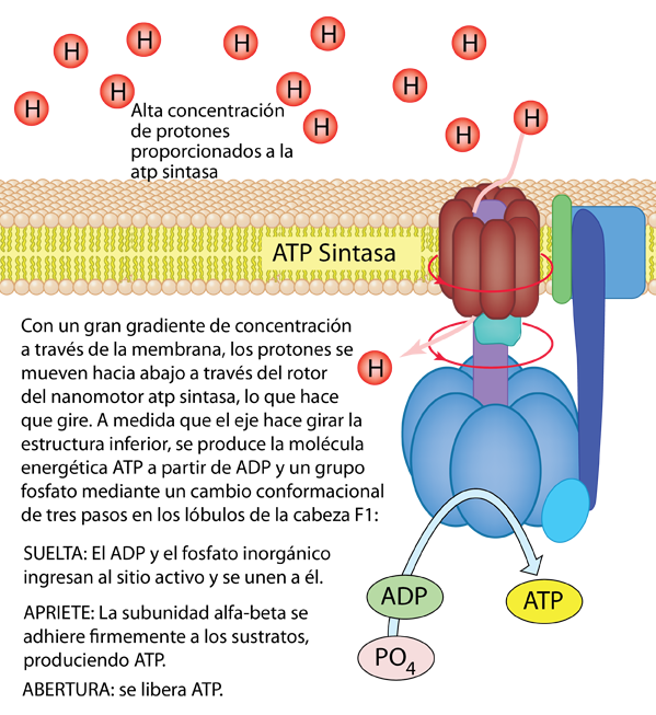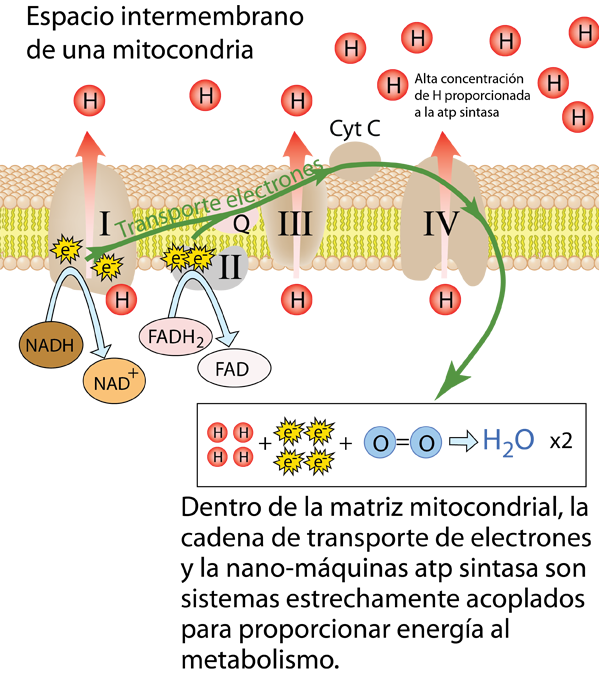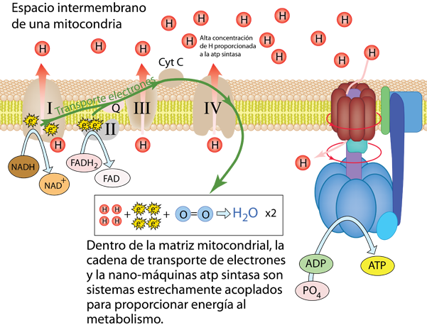 Sistemas Acoplados: la Cadena de Transporte de Electrones y la Fosforilación Oxidativa![]() En las mitocondrias de casi todos los tipos de vida por encima de las bacterias, los dos sistemas estrechamente acoplados de la cadena de transporte de electrones y la ATP sintasa actúan continuamente para proporcionar energía esencial para los procesos vitales. La visualización de los dos sistemas anteriores sigue elementos de Ahern y Karp. |
