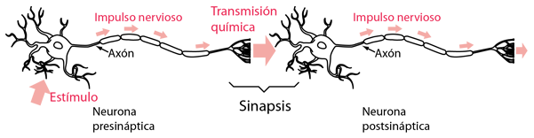 Las células nerviosas que se utilizan para la percepción de los acontecimientos externos, al ser excitada por el estímulo adecuado, transmiten un potencial de acción a lo largo de sus axones. Cuando la señal eléctrica alcanza el haz del terminal del axón, interactúa con estructuras llamadas perillas sinápticas. Estas estimulan la afluencia de calcio (Ca2+) a través de puertas Ca2+ activadas por voltaje. Esto origina el movimiento de vesículas hacia las membranas de las perillas sinápticas. Dentro de estas vesículas hay neurotransmisores químicos. Los neurotransmisores se fabrican en el cuerpo de la célula y viajan a lo largo del axón para ser almacenados en las vesículas asociadas con las perillas sinápticas. Cuando una vesícula alcanza la membrana celular de la perilla sináptica, se fusiona con la membrana celular y libera su neurotransmisor en la región sináptica. En la neurona postsináptica hay receptores que se unirán específicamente a estos neurotransmisores. El neurotransmisor excitará o inhibirá la activación de la neurona postsináptica. Uno de los mecanismos para la inhibición de la activación de la neurona postsináptica, consiste en la hiperpolarización, como la que sigue el pulso de un potencial de acción. Este elevará el umbral para la activación de la neurona. Téngase en cuenta que las neuronas pre- y post-sinápticas se han dibujado de forma idéntica arriba, pero eso es sólo por la ignorancia de sus diferencias estructurales.