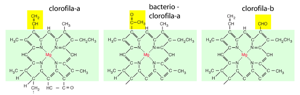 Pigmentos Accesorios en la FotosíntesisLa clorofila-a es el pigmento principal de la fotosíntesis en las plantas, pero el rango de absorción de la luz es ampliado por la clorofila-b, el beta-caroteno y otros pigmentos accesorios. ![]() Arriba se indican las variaciones de clorofila y la versión bacteriana. El rango de absorción de la luz, es ampliado un poco hacia el centro del espectro visible, por el contenido de carotenoides en las hojas.