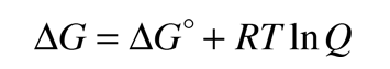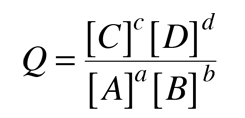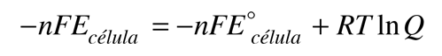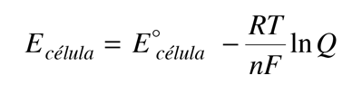 La cantidad Q, la constante de reacción termodinámica, es como una versión dinámica de la constante de equilibrio en la que las concentraciones y las presiones de gas, son los valores instantáneos en la mezcla de la reacción. Para una reacción ![]() el cociente de la reacción tiene la forma ![]() donde [C] se entiende que es la concentración molar del producto C, o la presión parcial en atmósferas si se trata de un gas. Aplicado a la célula Daniell donde el zinc y el cobre forman los electrodos, la reacción es Zn(s) + Cu2+(aq) <-> Zn2+(aq) + Cu(s) la forma de Q es ![]() ya que a las concentraciones de los sólidos metálicos puros se les asigna el valor 1. Esto implica que la variación del potencial de célula desde su valor estándar de 1,10 voltios se verá influenciada por la temperatura y las concentraciones de iones.