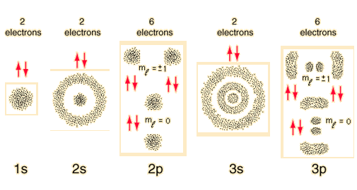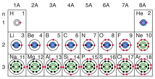 El llenado del orbital 2p coloca ocho electrones en la segunda capa, un "octeto estable". Esta configuración particularmente estable produce el gas noble neón. Pero el flúor con uno menos que un octeto estable es ¡muy activo!. Tiende a ganar un electrón, mientras que el sodio muy activo tiende a perder un electrón, produciéndose en cada caso la configuración del octeto estable del neón. Las configuraciones orbitales de electrones proporcionan una estructura para comprender las reacciones químicas, que se guían por el principio de la búsqueda de la configuración de electrones con la energía más baja (más estable). Decimos que el sodio tiene una valencia de 1, porque tiene tendencia a perder un electrón, y el cloro tiene una valencia de -1, porque tiene tendencia a ganar un electrón. Ambos átomos son muy activos químicamente, y su combinación es el caso clásico de enlace iónico. ![]() Los compuestos químicos que contienen elementos de las tres primeras filas de la tabla periódica, pueden ser bien entendidos con el tipo de consideraciones orbitales de más arriba. Las cosas se vuelven más complicadas en la cuarta fila de la tabla periódica. Los electrones 4s descienden en energía por debajo de los electrones 3d, y puesto que hay diez posibles combinaciones de números cuánticos en la sub-capa d, esto inserta 10 elementos entre los subniveles 4s y 4p, los llamados "elementos de transición". ![]()