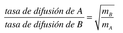 Velocidad de DifusiónPuesto que la energía cinética media de los diferentes tipos de moléculas (masas diferentes) que están en equilibrio térmico es la misma, entonces sus velocidades medias son diferentes. Su velocidad de difusión media, se espera que dependa de esa velocidad media, la cual le da una velocidad de difusión relativa ![]() donde la constante k depende de factores geométricos, incluyendo el área transversal donde tiene lugar la difusión. La velocidad de difusión relativa para dos especies moleculares diferentes, está dado entonces por ![]() |