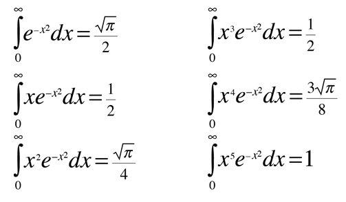 | Integrales Definidas Asociadas con la Distribución GausianaEn los sistemas físicos que se pueden modelar por una distribución gausiana, a veces se necesita obtener el valor medio o esperado de determinadas cantidades físicas. Si estas propiedades dependen de x, entonces se pueden integrar para encontrar el valor promedio. Para las seis primeras potencias de x, las integrales tienen las siguientes formas: