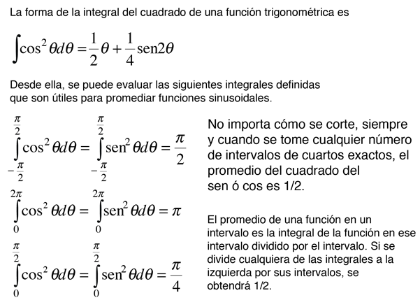| Integrales Definidas de los Cuadrados de Funciones TrigonométricasLos cuadrados de las funciones trigonométricas aparecen cuando tratamos con funciones sinusoidales asociadas con ondas o funciones asociadas con circuitos eléctricos de AC. Si se promedian, entonces el promedio del cuadrado de una función trigonométrica da como resultado 1/2, siempre que se tome un número entero de cuartos de periodos.