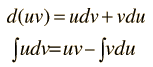 Integración por PartesLa integración por partes es una estrategia útil en la simplificación de algunas integrales. Se basa en la regla de combinación de las funciones diferenciales, cuyo enfoque general se puede resumir de la siguiente manera ![]() Esta técnica es particularmente apropiada para suprimir un término lineal que multiplique a un exponencial. Por ejemplo, la integral ![]() se puede simplificar haciendo ![]() Entonces u se puede derivar y dv se puede integrar. ![]() Y el valor de la integral será ![]()