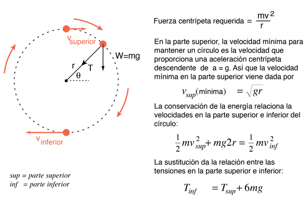 | Movimiento en un Círculo Vertical El movimiento de una masa sobre una cuerda en un círculo vertical, incluye una variedad de conceptos mecánicos. Debe satisfacer la restricción de la fuerza centrípeta para permanecer en un círculo y debe satisfacer las demandas de la conservación de la energía a medida que la energía potencial gravitacional se convierte en energía cinética cuando la masa se mueve hacia abajo. La velocidad debe incrementarse al tiempo que la masa se mueve hacia abajo desde lo alto del círculo, sujeta a las restricciones establecidas. | Indice Movimiento Rotacional | ||