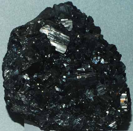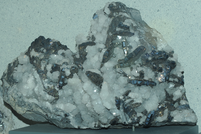 Esta muestra de bournonita mide unos 40 cm de ancho, y procede de la mina Herodsfoot, Liskeard, Cornwall, Inglaterra. Está etiquetada como bournonita con cuarzo. Debido a su forma, estos cristales se denominan cristales de rueda dentada.