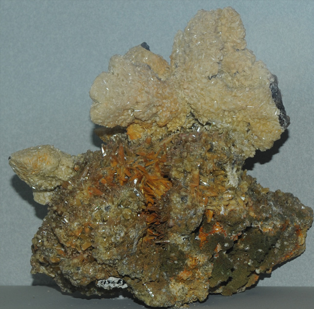 Esta muestra de cerusita mide unos 20x20 cm, y procede de Tsumeb, Namibia. Está etiquetada como formada con mimetita.