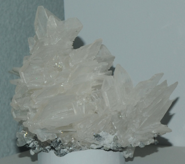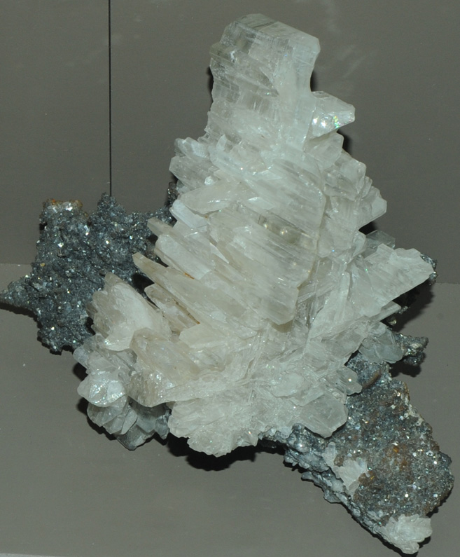 Esta muestra de cerusita se exhibe en el Museo Smithsonian de Historia Natural. La cerusita es un mineral de carbonato de plomo, con la composición PbCO3. Esta muestra mide aproximadamente 14x10 cm, y procede de Tsumeb, Namibia.