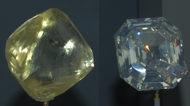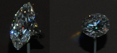 A la izquierda hay un anillo de diamantes de 'tallado marquise' de 28,3 quilates. A la derecha está el diamante Pearson de 16,72 quilates, procedente de Sudáfrica. El 'tallado brillante redondo', realza las superiores cualidades de este diamante sin defectos, casi incoloro. |