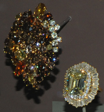 Este broche de diamantes de 61,3 quilates, y el anillo de diamante de 22 quilates, son de origen desconocido. El broche es de oro de 18 quilates y contiene 71 diamantes que varían en peso, desde 0,3 hasta 2,5 quilates. Los colores son naturales. El diamante amarillo de 'tallado esmeralda', está montado sobre un hueco de anillo, diseñado para ser usado como colgante o anillo.