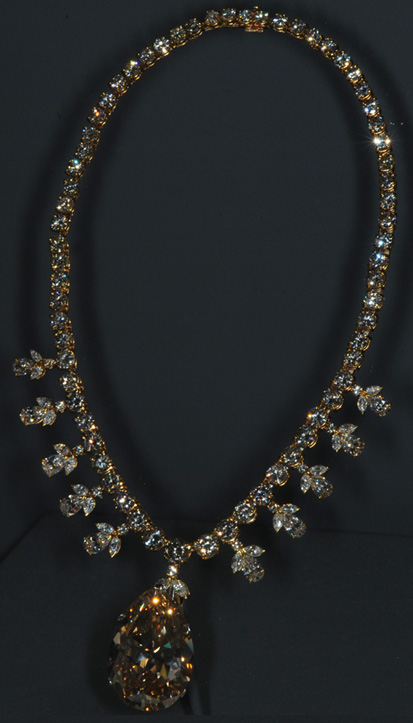 "La Victoria-Transvaal es una piedra preciosa en forma de pera, de color amarillo ocre de 67,89 quilates. Fue tallada a partir de un cristal de 240 quilates que fue encontrado en el Transvaal, Sudáfrica. El primer tallado produjo una piedra de 116 caras, que mide 1x1/8 pulgadas, y pesa 75 quilates; un retallado posterior mantuvo la misma longitud y anchura, pero redujo la profundidad a mejores proporciones, haciéndolo más brillante. El diamante ha sido presentado en varias películas de Hollywood, incluyendo un episodio de Tarzán de 1952 titulado Tarzán y la furia salvaje, y en exposiciones en los Estados Unidos y Canadá. El collar fue diseñado por Baumgold Brothers, Inc, y consiste en una cadena de oro amarillo con 66 diamantes tallados en 'forma de brillante redondo', bordeado con motivos de diez juegos de gotas, cada juego con dos diamantes tallados en 'forma de marquesa', un diamante tallado en 'forma de pera', y un pequeño diamante tallado en 'forma de brillante redondo' (el peso total de los 106 diamantes es de unos 45 quilates)."