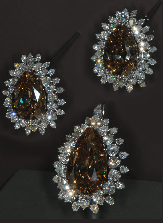 El broche pesa 36,73 quilates y las sujeciones 39,58 quilates. Los tres diamantes en forma de pera de color coñac, se tallaron en 1956 a partir de un cristal simple de 264 quilates. Diamantes blancos en forma de pera, con cerca de 20 quilates, acentúan el juego del conjunto.