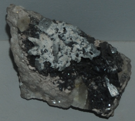 Esta muestra de pirocroíta se exhibe en el Museo Smithsonian de Historia Natural. La pirocroíta es un hidróxido de manganeso, con la composición Mn(OH)2 . Esta muestra mide aproximadamente 8x5 cm, y procede de la mina Langban, Filipstad, Värmland, Suecia. Está etiquetada como pirocroíta con plomo.