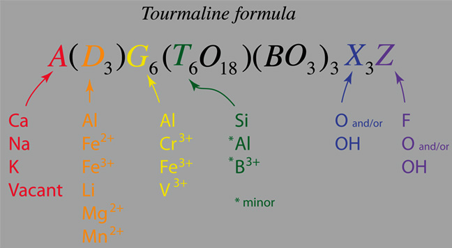La turmalina se utiliza comúnmente para una familia de 11 minerales que comparten esta disposición estructural. El nombre de turmalina viene de la palabra "turmali", usada por los comerciantes de gemas de Sri Lanka, para describir una mezcla indeterminada de piedras preciosas. Estas piedras preciosas se encuentran comúnmente en pegmatitas, donde existen las condiciones para el crecimiento de cristales espectaculares. Estos son algunos ejemplos de la familia de la turmalina: