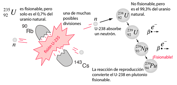 | Reproducción de Plutonio-239El plutonio-230 fisible, se puede producir a partir del uranio-238 no fisible, por la reacción ilustrada.