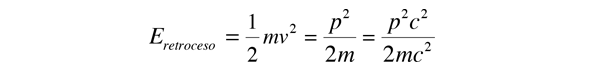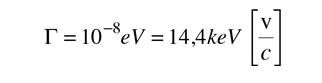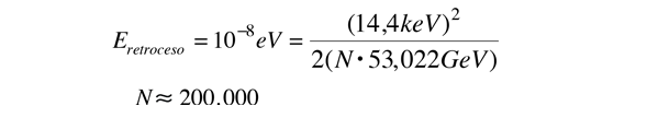 Aunque un átomo puede emitir un fotón que es absorbido por la transición inversa en un átomo idéntico a una corta distancia, (fluorescencia de resonancia) lo mismo no puede suceder en las transiciones nucleares de los núcleos aislados. La razón es la gran energía de retroceso en comparación con la anchura de línea natural de la transición. Usando el hierro como ejemplo, el rayo gamma de 14,4 keV tiene un momento pc = 14,4 keV. El momento de retroceso del núcleo de hierro emisor debe coincidir con ese valor, si actúa como una partícula aislada. La energía de retroceso puede ser calculada a partir del momento, y por lo general es conveniente en tales casos, poner todo en electrón-voltios. ![]() La energía de retroceso del núcleo de hierro-57 es