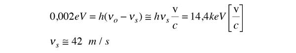 Esto es de cinco órdenes de magnitud mayor, que la anchura de línea natural de la transición del hierro que produce el fotón. Esta energía de retroceso reduce la energía del fotón por esta cantidad, como se ve por un potencial núcleo absorbente en reposo. Para conseguir la absorción de resonancia, se tiene dos opciones: clavar el núcleo en una red cristalina de modo que casi no tenga retroceso, o mover la fuente y el absorbedor entre sí, de manera que el desplazamiento Doppler del fotón, lo mueva a la energía necesaria para la absorción. El desplazamiento Doppler de un fotón es un desplazamiento Doppler relativista dado por ![]() Si v/c<<1 entonces puede ser simplificada por ![]() ![]() Aunque esto es posible, y se llevó a cabo con puntas de centrífuga, generalmente hay una manera mejor. Mossbauer encontró que si se enfriaba el emisor, se podía llegar a una condición en la que el núcleo emisor no podría retroceder por sí mismo. Cualitativamente, la razón es que a temperaturas suficientemente bajas, un átomo en una red cristalina no puede retroceder individualmente. La cuantización de los estados vibracionales del cristal, hace que la energía de retroceso sea absorbida por la red como un todo. Fue un gran avance darse cuenta de que se podía conseguir la absorción de resonancia de rayos gamma, poniendo los núcleos de origen en un cristal y enfriarlos. Para ver la cantidad de núcleos de hierro que tendrían que retroceder juntos, para mantener los rayos gamma dentro del ancho de línea natural: ![]() En comparación con el número de Avogadro, no son muchos. De hecho, es una partícula de materia demasiado pequeña para ser vista en un microscopio óptico. De ello se sigue que cualquier pequeño cristal dentro de una pieza de hierro que contiene cobalto-57, cumpliría con las condiciones para la absorción de resonancia si se enfriara lo suficiente. Se estableció que se puede producir la absorción gamma resonante por enfriamiento de una muestra de hierro. También se puede destruir esa resonancia, moviendo la fuente en relación con el absorbente. Volviendo a la expresión Doppler ![]() da v = 0,0002 m/s para producir suficiente efecto Doppler del rayo gamma emitido, para desafinar la absorción resonante. Esto es más que una curiosidad -esto es la base para un instrumento increiblemente sensible-. Pound y Rebka necesitaron tan sólo tal instrumento para probar el desplazamiento al rojo gravitacional.