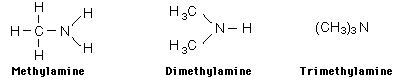 Ejemplos que muestran diferentes maneras de fórmulas condensadas son: ![]() El hecho de que las aminas tiendan a tener malos olores se destaca por los nombres de dos aminas: la cadaverina y la putresina. Las aminas son compuestos básicos con olores fuertes. El olor de las aminas se describe a menudo como "olor a pescado", ya que el olor del pescado crudo proviene de las aminas contenidas. A veces, incluso el término "mal olor" es un eufemismo, y dos de las aminas producidas en la carne en descomposición tienen nombres sugerentes (cadaverina y putresina). A pesar de esta mala reputación, las aminas son esenciales para la vida como los constituyentes de los aminoácidos. Se encuentran en los medicamentos y vitaminas, y son materias primas esenciales para muchos procesos sintéticos. La amina aromática anilina es la base para la síntesis de toda una clase de colorantes sintéticos. Las aminas sintéticas como la benzedrina, tienen aplicaciones médicas.