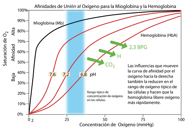 ![]() Los detalles del entorno polipeptídico de la mioglobina y la hemoglobina se unen al oxígeno pero protegen al hierro de la oxidación. Este ambiente exquisitamente equilibrado permite que el oxígeno se una y se libere para que pueda unirse a otro oxígeno. El marco para sostener el hemo incluye dos histidinas que ayudan a estabilizar el hemo en una bolsa de la estructura globular de mioglobina o hemoglobina. La bolsa de hemo es ideal para el oxígeno, pero el monóxido de carbono en realidad se une tanto a la hemoglobina como a la mioglobina con una afinidad mucho mayor y esa unión no es fácilmente reversible. Esto hace que el CO sea un potente veneno en el cuerpo. ![]() Cuando se le proporciona un suministro de oxígeno, la mioglobina se unirá al oxígeno rápidamente incluso a presiones parciales de oxígeno muy bajas. Eso lo hace eficiente como lugar de almacenamiento de oxígeno, pero este tipo de curva de afinidad lo convierte en un pobre proveedor de oxígeno a valores típicos de presión parcial en los tejidos. La afinidad de la hemoglobina comienza baja y aumenta gradualmente hasta una presión parcial de suministro de aproximadamente 20 mmHg, pero luego aumenta bruscamente. Este cambio en su comportamiento (un efecto alostérico) se debe al hecho de que la unión de una molécula de oxígeno al primero de los cuatro hemos provoca un cambio de configuración en la hemoglobina que le facilita la unión del oxígeno a los otros tres hemos. A esto se le llama "enlace cooperativo" y es de enorme importancia en la eficiencia del transporte de oxígeno en los animales. ![]() La mioglobina en el tejido, especialmente en el tejido muscular, acepta oxígeno de la hemoglobina y lo almacena. Luego puede entregar el oxígeno a las mitocondrias cuando sus necesidades de oxígeno sean lo suficientemente grandes. ![]() El pH de la sangre está cerca del pH neutro de 7,4, normalmente oscila entre 7,35 y 7,45 y debe mantenerse en ese rango. Pero dentro de las células, el pH puede variar en un rango más amplio y afecta el proceso de suministro de oxígeno. Si el pH se vuelve más bajo (más ácido), la curva de afinidad de oxígeno de la hemoglobina se mueve hacia la derecha como se muestra arriba, y exhibe una menor afinidad en el rango de concentración de oxígeno típico del interior celular. El metabolismo activo en la célula produce CO2 y H, que actúan para reducir el pH. Esto hace que el oxígeno se libere más rápidamente en un efecto conocido como efecto Bohr, que lleva el nombre de Christian Bohr, quien descubrió este fenómeno.