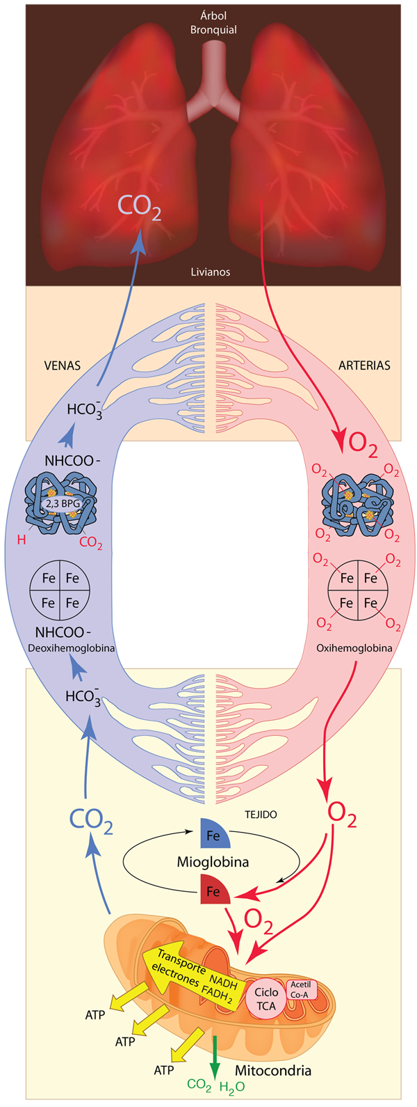 Hemoglobina y MioglobinaEl sistema respiratorio debe proporcionar un suministro continuo de oxígeno a todas las partes del cuerpo. El oxígeno es necesario para el metabolismo en todo el cuerpo y el destino final de su viaje es el proceso de proporcionar energía en forma de ATP para todas las partes de los procesos del cuerpo. Como se muestra a continuación, el proceso que comienza en los pulmones utiliza una proteína de transporte llamada hemoglobina para transportar el oxígeno a los tejidos y también hace un uso extensivo de otra proteína, la mioglobina, para el almacenamiento de energía. La hemoglobina es transportada por los glóbulos rojos en la sangre. El oxígeno se transporta a las mitocondrias en las células donde la cadena de transporte de electrones finalmente coloca el oxígeno en las moléculas de agua, para ser exhalado. ![]()